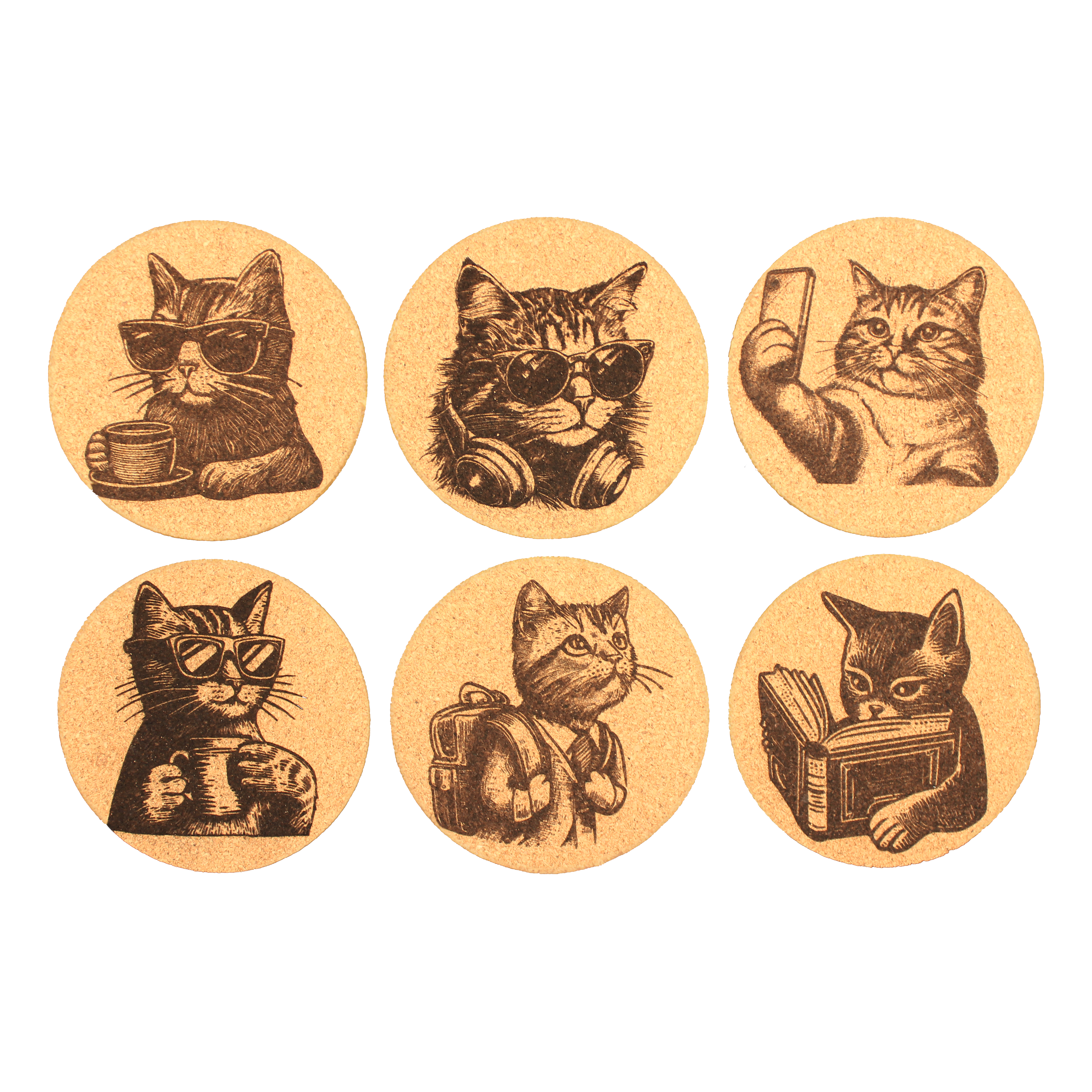 Diese einzigartige Kollektion umfasst 6 Untersetzer mit entzückenden Katzenmotiven, darunter Katzen mit Rucksack, Katzen mit Café und viele mehr.