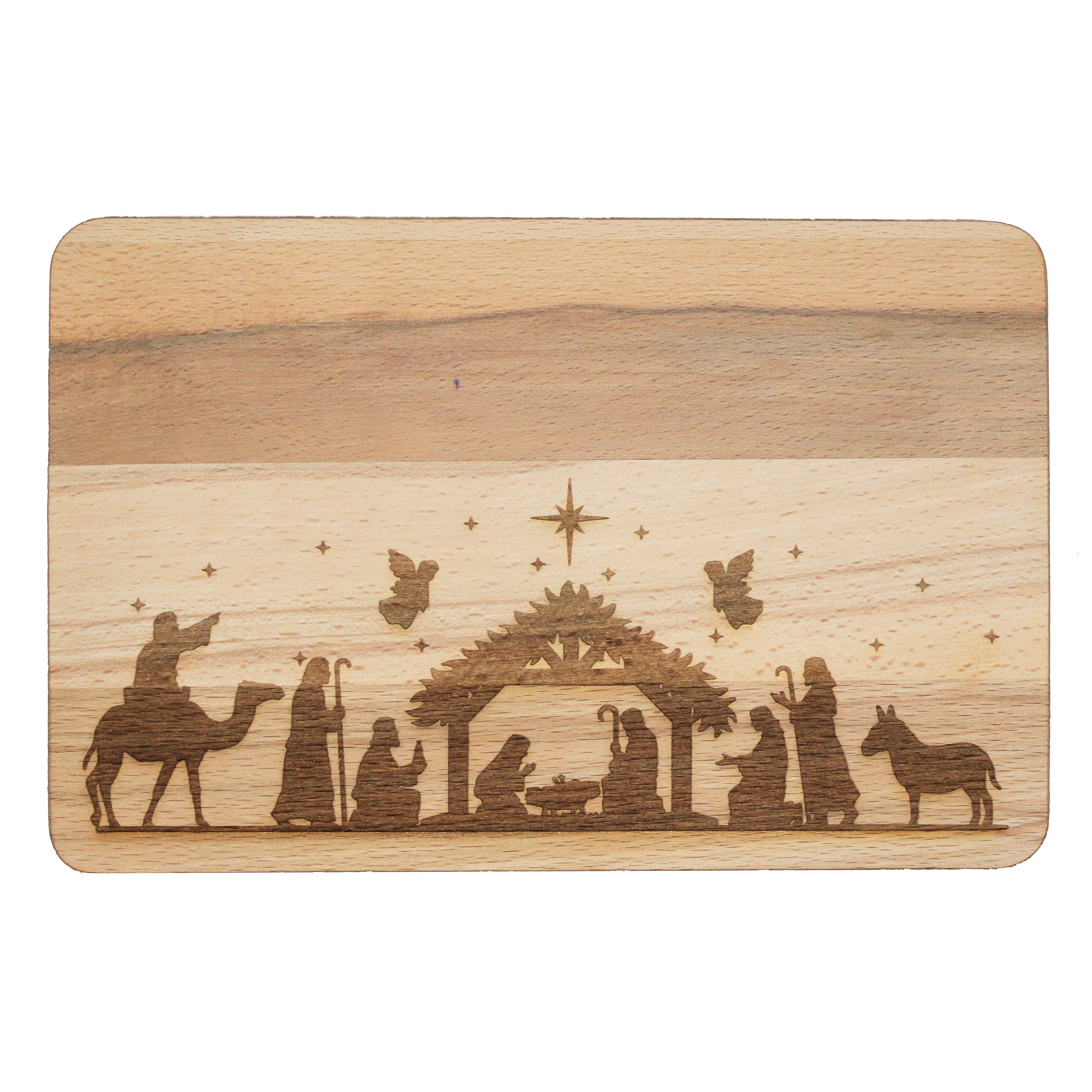 Ein Stück Tradition zum Frühstück: Unser Brettchen aus massivem Buchenholz zeigt eine friedliche Krippenszene – bei uns im Haus präzise per Laser graviert.